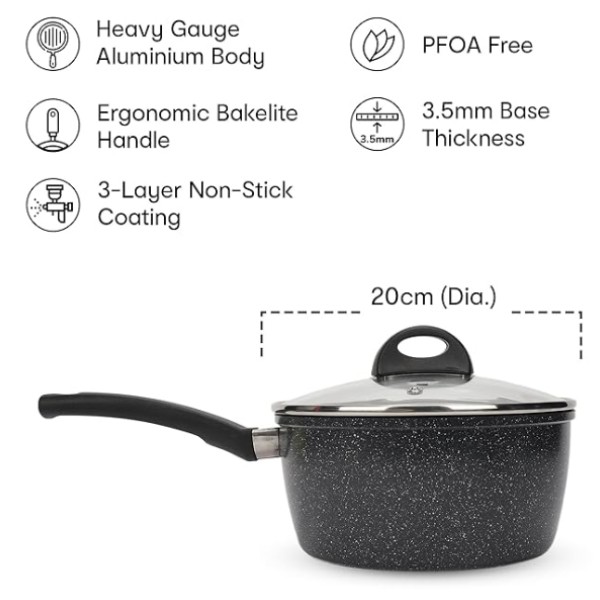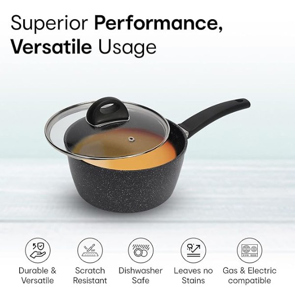 • SOFT-TOUCH HANDLE & GLASS LID: The soft-touch Bakelite handle is soft and provides safe handling. The 4-mm tempered glass lid of this non-stick saucepan allows you to monitor your cooking.