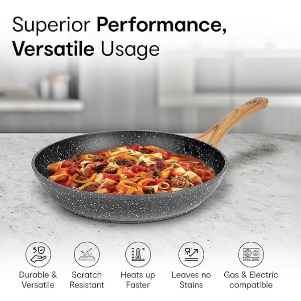 • DURABLE MATERIAL: Made of heavy-grade 3003 aluminium alloy, and having a 410SS surgical-grade stainless steel bottom induction plate, this frying pan ensures consistent and quick heating.