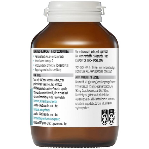 Help maintain your heart, skin, eye and brain health with Blackmores Fish Oil 1000 Odourless capsules. This formula provides a high-quality natural source of omega-3, ideal for those who don't eat fish two to three times per week. Blackmores Fish Oil 1000 Odourless is extracted from 100% wild caught fish. The extraction process ensures purified, high-quality oil that is tested for mercury, dioxins and PCBs. Adults: Take 2 capsules once a day for your general health and wellbeing.Suitable For: Adults only or pierce tab and squeeze contents into milk for children to consume