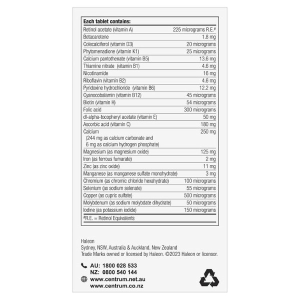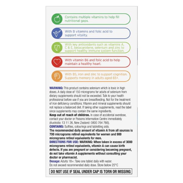 This product contains selenium which is toxic in high doses. A daily dose of 150 micrograms for adults of selenium from dietary supplements should not be exceeded. Talk to your health professional before you use if you are breastfeeding. Not for the treatment of iron deficiency conditions. Vitamin and mineral supplements should not replace a balanced diet. If taking other supplements, read the label since supplements may contain the same ingredients. Keep out of reach of children. In case of accidental overdose, discontinue use and immediately contact your doctor or Poisons Information Centre (Australia: 13 11 26, New Zealand: 0800 764 766). The recommended daily amount of Vitamin A from all sources is 700 micrograms retinol equivalents for women and 900 micrograms retinol equivalents for men. When taken in excess of 3000 micrograms retinol equivalents, Vitamin A can cause birth defects. If you are pregnant or considering. becoming pregnant, do not take Vitamin A supplements without consulting your doctor or pharmacist.Active Ingredients: Retinol Acetate (Vitamin A) 225 micrograms R.E. (Retinol Equivalents), Betacarotene 1.8mg, Colecalciferol (Vitamin D3) 20 micrograms, Phytomenadione (Vitamin K1) 25 micrograms, Calcium Pantothenate 13.6mg (equiv. Pantothenic acid 12.5mg), Thiamine Nitrate (Vitamin B1) 4.6mg, Nicotinamide 16mg, Riboflavin (Vitamin B2) 4.6mg, Pyridoxine Hydrochloride (Vitamin B6) 12.2mg, Cyanocobalamin (Vitamin B12) 45 micrograms, Biotin (Vitamin H) 54 micrograms, Folic Acid 300 micrograms, dl-alpha-Tocopheryl Acetate (Vitamin E) 50mg, Ascorbic Acid (Vitamin C) 180mg, Calcium (244mg as Calcium Carbonate and 6mg as Calcium Hydrogen Phosphate) 250mg, Magnesium (as Magnesium Oxide) 125mg, Iron (as Ferrous Fumarate) 2mg, Zinc (as Zinc Oxide) 11mg, Manganese (as Manganese Sulfate Monohydrate) 3mg, Chromium (as Chromic Chloride Hexahydrate) 100 micrograms, Selenium (as Sodium Selenate) 55 micrograms, Copper (as Cupric Sulfate) 500 micrograms, Molybdenum (as Sodium Molybdate Dihydrate) 50 micrograms, Iodine (as Potassium Iodide) 150 micrograms.